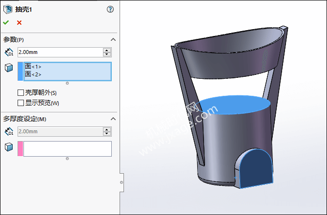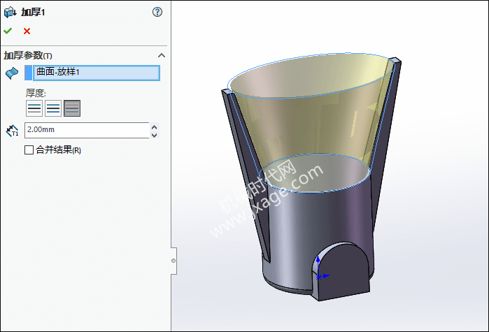 10.将放样曲面显示出来,点击【插入】-【凸台/基体】-【加厚】,将放样曲面进行加厚,厚度为2mm。