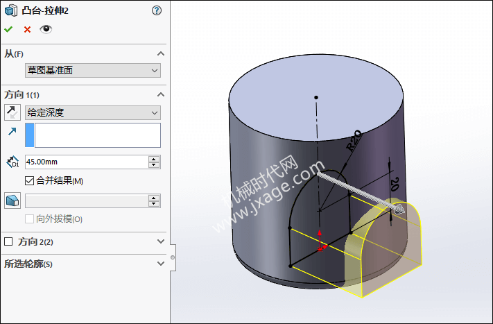 设置拉伸的深度为45mm,注意勾选合并结果。
