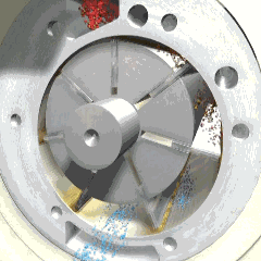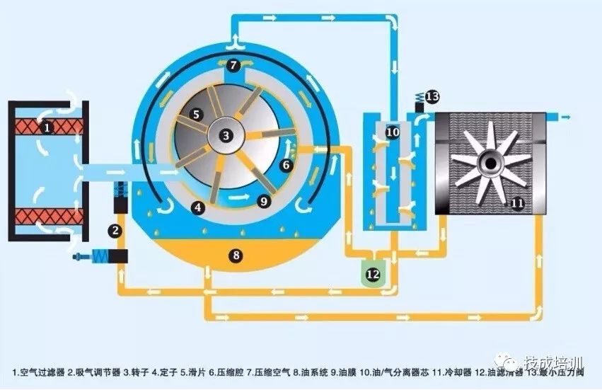 转子旋转相对于气缸呈偏心式运转、阀片安装在转子的槽中,通过离心力将滑片推至气缸壁,高效的注油系统能够确保压缩机的冷却及润滑剂的最小损耗量,在气缸壁上形成的一层薄薄的油膜可以防止金属部件之间直接接触而造成磨损。