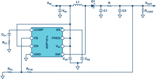 图3. 在输出端添加RC滤波器的ADP161x低输出电流升压转换器设计
