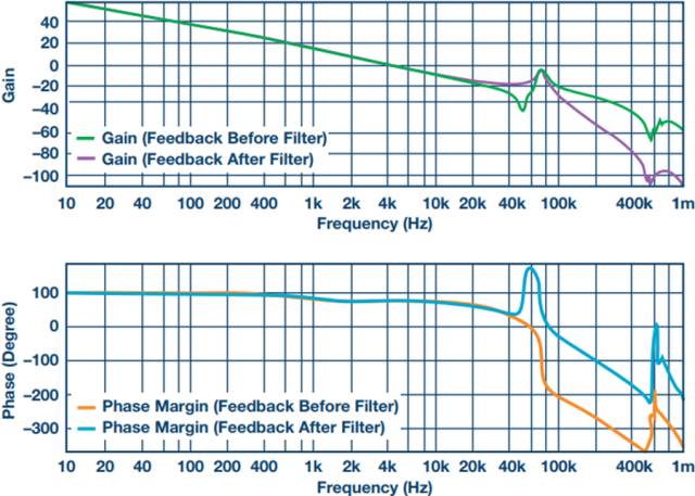 反馈在滤波器电感之前或之后获取。人们没有想到的是,哪怕滤波器不在反馈环路内部,开环波特图依然存在非常大的变化。由于控制环路无论滤波器是否在反馈环路中都会受影响,因此也应对其进行适当补偿。一般而言,这意味着将目标交越频率向下调整至不超过滤波器谐振频率(FRES)的五分之一到十分之一。