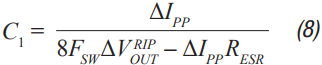 正如之前的拓扑,选择C1,使其等于没有输出滤波器时的情况。10 mV p-p至100 mV p-p是个不错的开始,具体取决于最终目标输出纹波。C1随后可通过公式8计算得出。C1在这个拓扑中可以采用比之前拓扑更小的数值,因为滤波器效率更高。