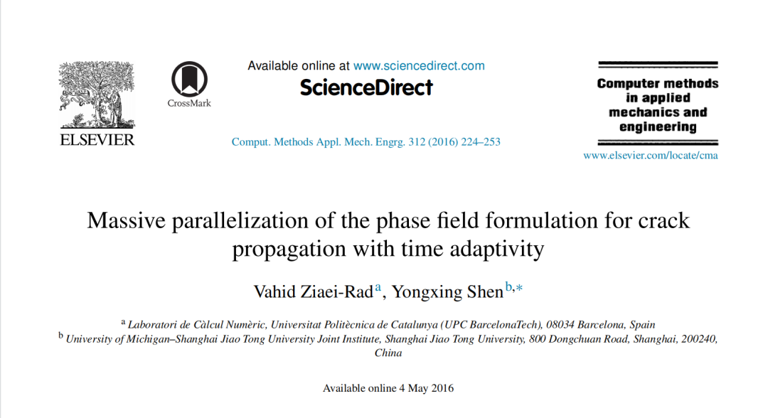 [1] Ziaei-Rad, V., & Shen, Y. (2016). Massive parallelization of the phase field formulation for crack propagation with time adaptivity. Computer Methods in Applied Mechanics and Engineering, 312, 224-253.