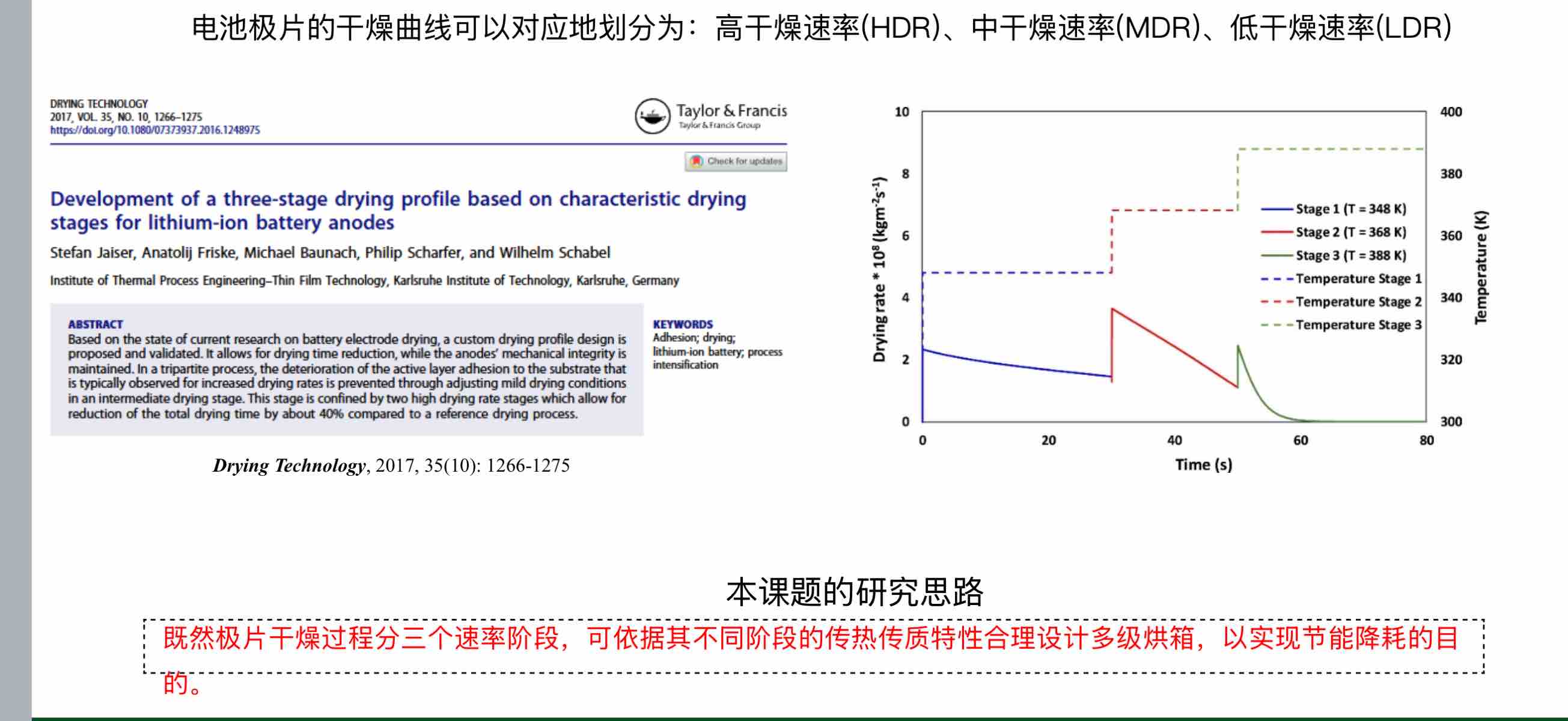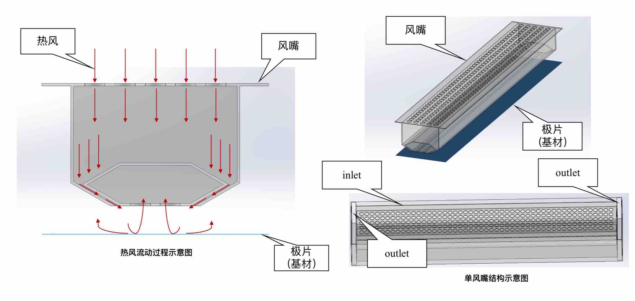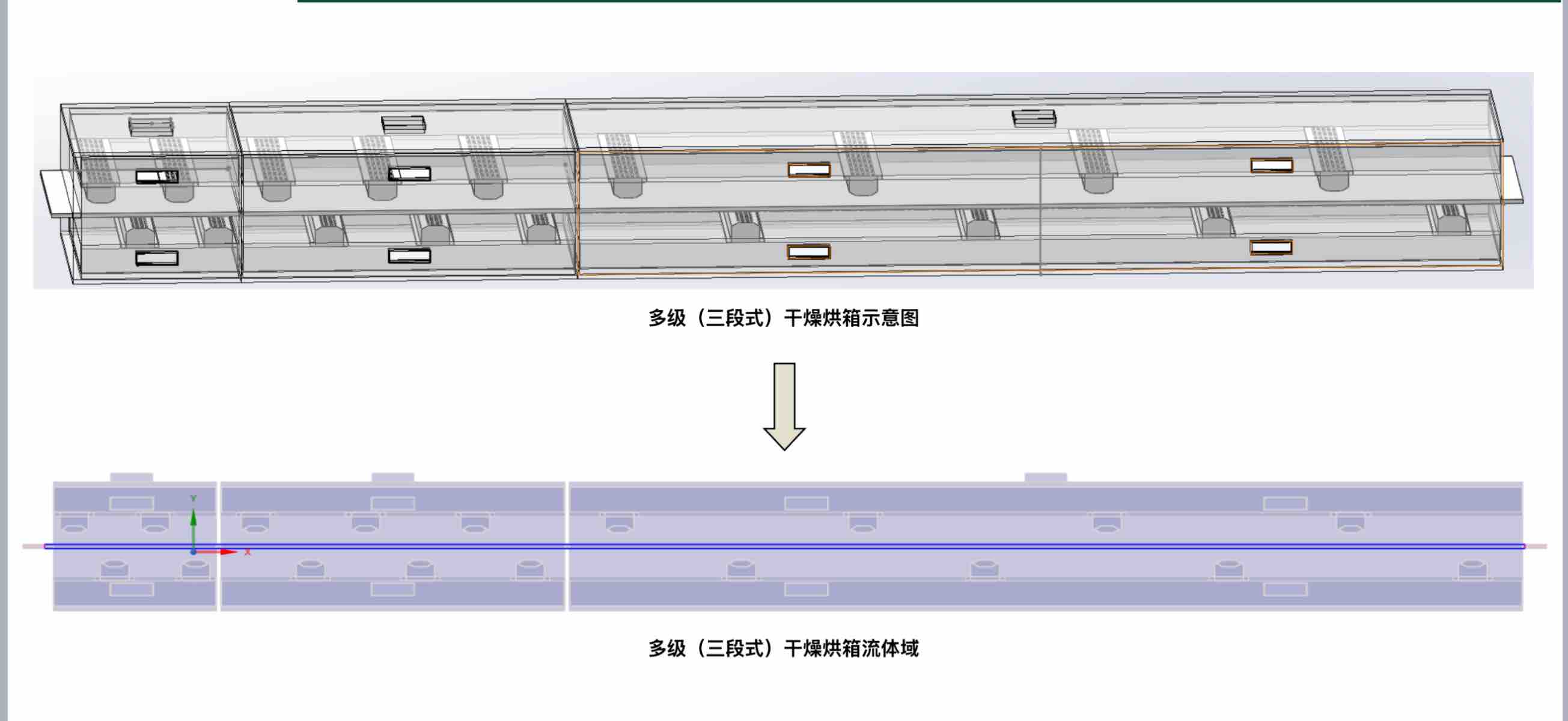 1.将模型跑通,然后对整个模型设置同一个进风边界条件,对基材(也就是锂电池极片)进行干燥。2.对每一个干燥过程(共三段)分别使用不同的输入参数组合,对极片进行干燥。干燥完成后与1中整个烘箱使用同一个参数组合的干燥方法进行干燥速率和整体能耗的对比分析,进而验证2更好。